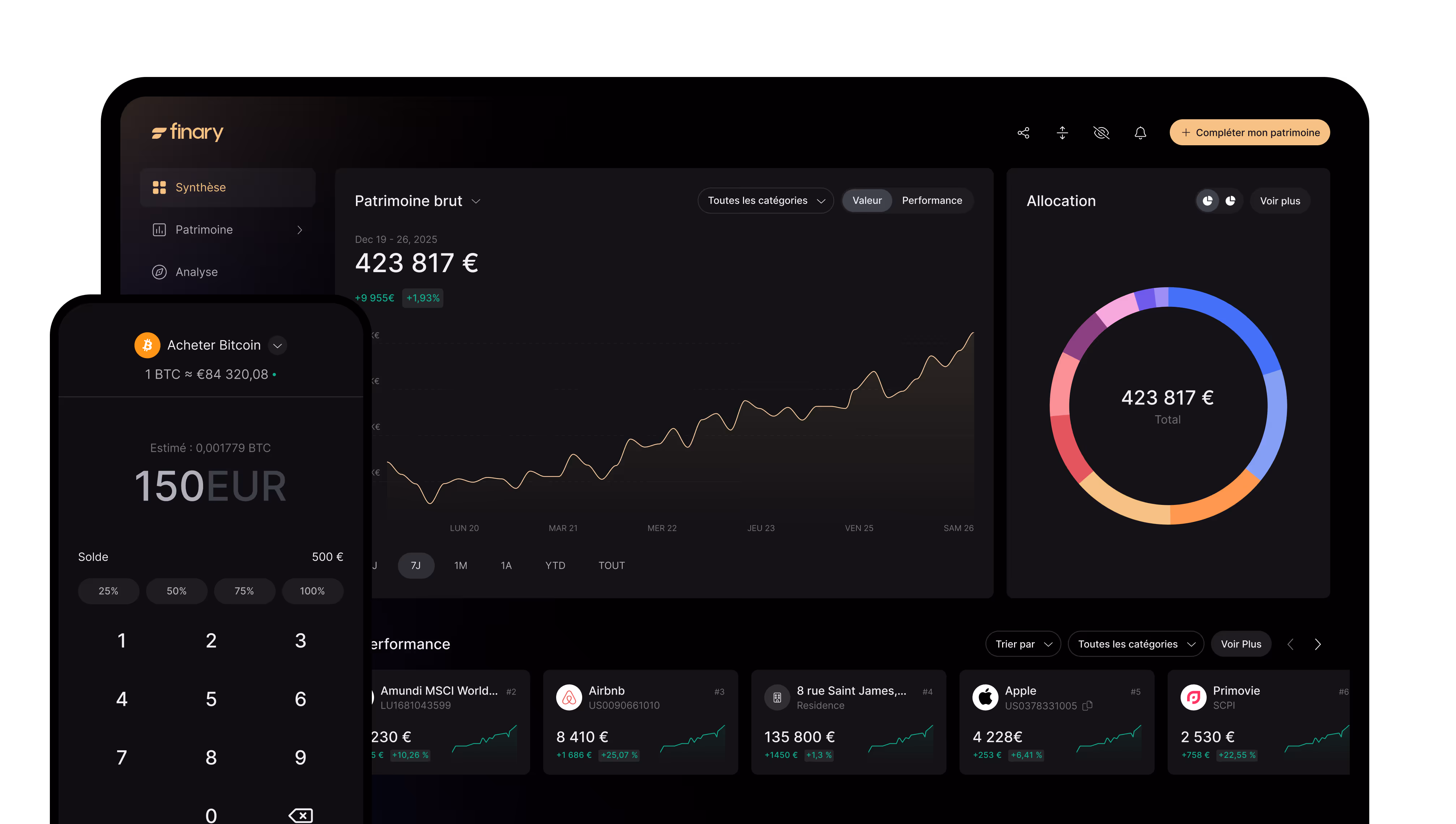 Finary SAS adhérent de la Chambre Nationale des Conseils en Gestion de Patrimoine au capital social de 1 625 000 euros, immatriculé au RCS de Paris sous le numéro 892 357 724, dont le siège social est situé 58 rue de Monceau 75380 Paris 8. Finary SAS exerce l’activité de Conseiller en Investissements Financiers (CIF) et de Courtier en Assurance référencé à l’Orias sous le numéro 21001279, adhérent de la Chambre Nationale des Conseils en Gestion de Patrimoine, association agréée par l’Autorité des Marchés Financiers, avec les garanties financières de l'Assurances Mutuelles MMA IARD.