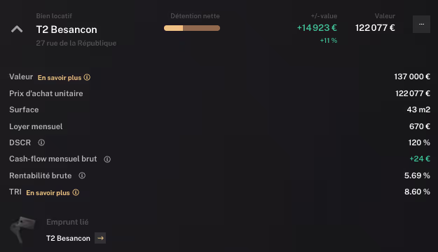 En liant un ou plusieurs emprunt(s) à un bien immobilier, vous pouvez suivre l'avancement de remboursement du bien ainsi que la valeur nette de l'immobilier. Enfin, nous calculons votre mensualité globale ainsi que d'autres indicateurs importants: