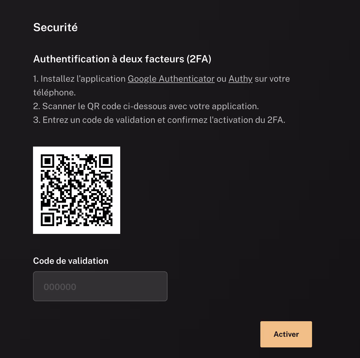Afin de sécuriser votre compte Finary, nous vous recommandons d'activer l'authentification à deux facteurs. L'activation se fait par QR code. N'oubliez pas de noter vos codes de récupérations, ils vous permettront de vous connecter en cas de perte de votre téléphone.