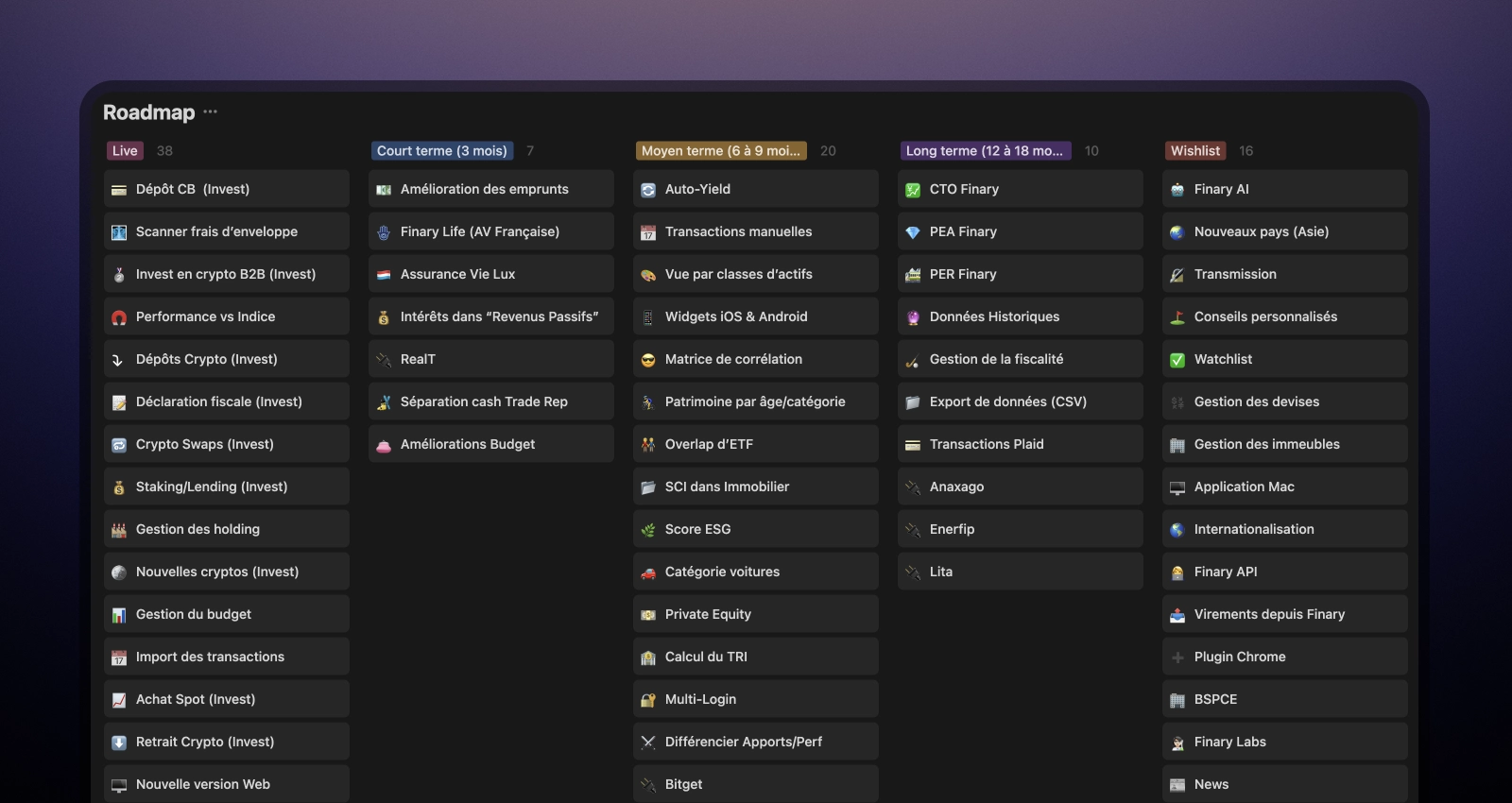 Nous travaillons sur des gros chantiers comme notre assurance-vie Finary Life et préparons le lancement de fonctionnalités plébiscitées par la communauté. Rendez-vous sur notre roadmap publique afin d’avoir une meilleure idée du timing des sorties. La majorité des changements se font en coulisse et seront visibles dans les mois à venir.
