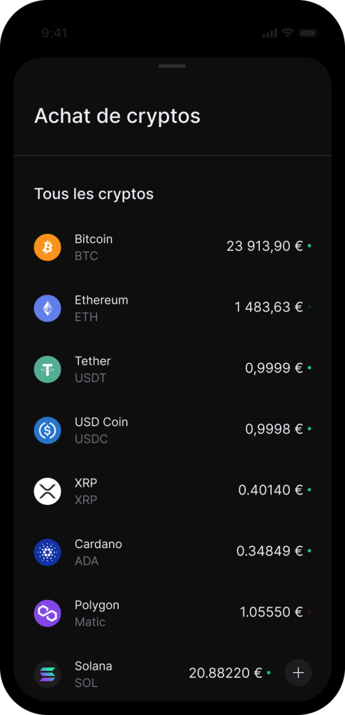 Finary propose une gamme étendue de cryptomonnaies, notamment Bitcoin (BTC), Ethereum (ETH), XRP, Cardano (ADA), Polygon (MATIC), Solana (SOL), Litecoin (LTC), Avalanche (AVAX), Uniswap (UNI), Chainlink (LINK), Bitcoin Cash (BCH), et Aave (AAVE), à des frais compétitifs et sans spread sur le prix.